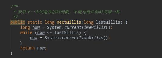 上面的逻辑做了判断,同一毫秒内就让序列加1,超过4095,就强制获取下一毫秒的值,等时间戳不是同一毫秒的时候,序列从新开始计算。看下如何强制获取下一毫秒: