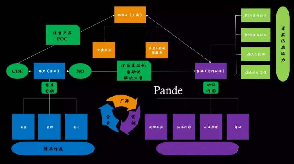 再从实施方说起,为了满足客户的需求,需要去落地机器人自动化方案,甚至还可能帮客户去搭建机器人卓越中心COE。
