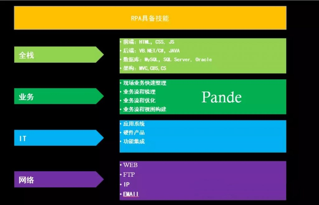 为什么说是全栈呢,是因为RPA开发的特殊性,自动化流程的效益特点就是短平快,所以在做的时候基本都是单兵作战,那么他具备的知识就必须要全面。A1:前端方面的HTML,CSS,JS 是为了对网页端进行操纵使用时,能利用RPA软件灵活的处理网页信息。当然如果能力可以,即使没有RPA软件也是可以对网页端进行处理。A2:后端方面的VB.NET或者C#,Python主要是为了能源码开发,虽然RPA软件功能很全面,但并不是万能的,有些没有的需要你用源码去处理,有些RPA处理速度太慢的,同样需要考虑用源码快速处理。A3:数据库是一项必备技能吧,任何一家企业估计都有自己的数据库,那么如何实现RPA与数据库的交互就需要懂得那些很常规的数据库知识:在线存储,主键索引,全局锁与表锁,增删改查等。A4:架构可能算是延伸吧,不过只要做过软件开发基本都必然会知道这个,如何能在规定的时间内满足客户对需求的处理,什么时候考虑高并发和分布式,都是保证RPA工程实现高效优质的技术指标。但不是说每样都要精通,熟悉就可以,因为毕竟有RPA神器作为辅助。(SD/SA)