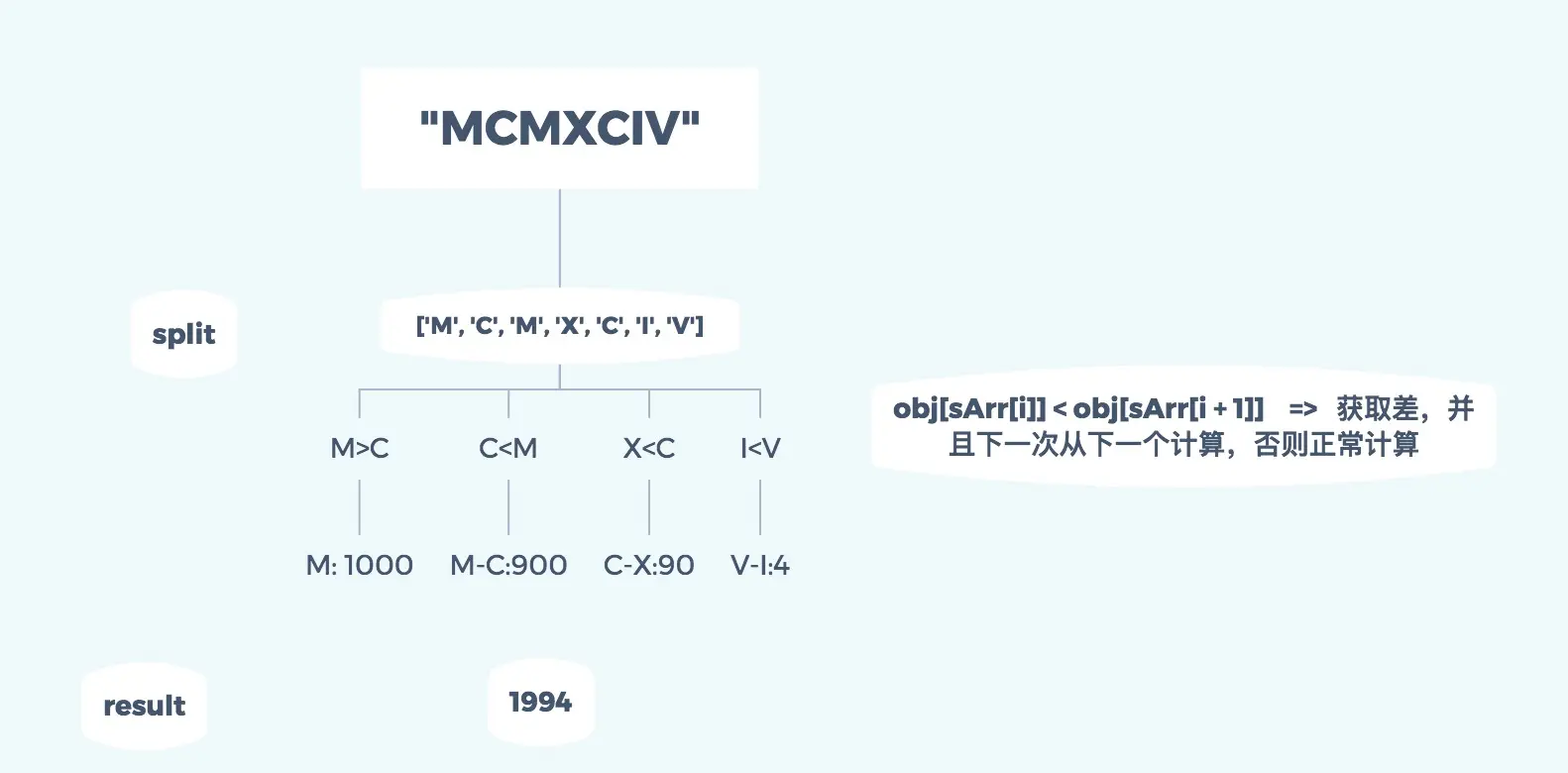 先写一个字典,让每一个罗马数字对应相应的数字,把需要处理的数字转化成数组,循环数组,如果前边的罗马字母对应的数字小于后面的罗马字母对应的数字,那就让大数减小数,并且增加i,防止前面计算过的罗马字母再次被计算