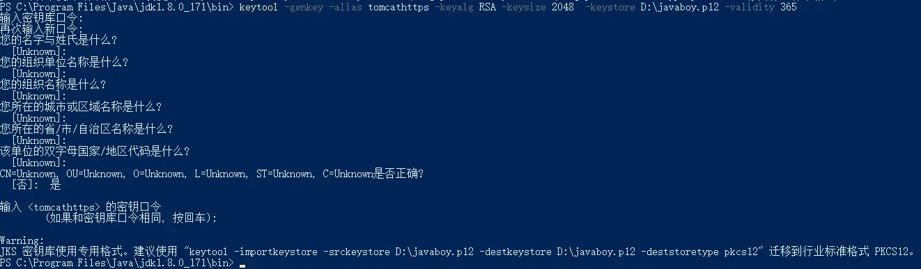 keytool -genkey -alias tomcathttps -keyalg RSA -keysize 2048 -keystore D:\javaboy.p12 -validity 365