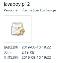 命令执行完成后 ,我们在 D 盘目录下会看到一个名为 javaboy.p12 的文件。如下图: