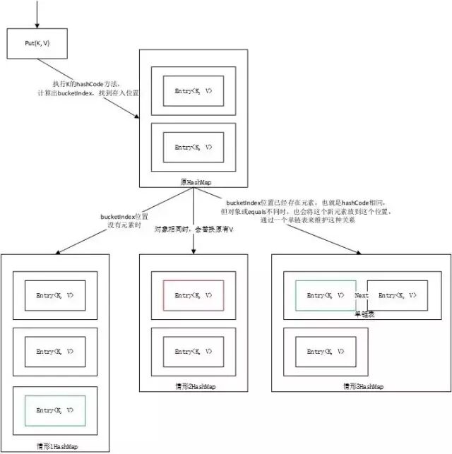我们在使用HashMap存储数据时会用到put(K,V)。我们都知道HashMap的K值是唯一的,其内部主要是通过哈希表管理所有元素保证唯一性。当我们调用put()时,HashMap会先调用K的HashCode方法获取哈希码,再通过哈希码快速找到某个存放位置,这个位置可以被称之为bucketIndex。
