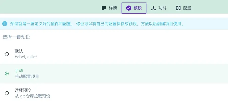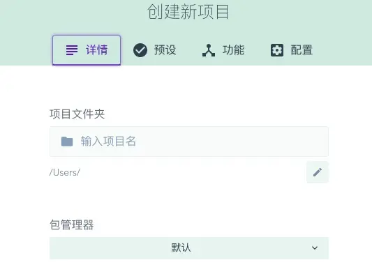 选择配置方式(默认(一)、自定义(二)),默认方式会直接创建项目,自定义会执行下一步选择对应配置