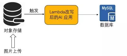 用Serverless架构改写了AI应用后,这些痛苦就通通消失了。Spring框架和Tomcat去掉了,用Lambda的Java SDK,只需要实现一个Function Handler处理图片上传完成这个事件,这跟写一个Callback一样简单。在Function Handler中调用图片识别的相关逻辑,然后调用数据库的REST API存储结果。也不用构建MVC,不用配置Tomcat的XML文件,我们将存储网关这个功能完全去除掉了,因为用户可以直接上传图片到对象存储。