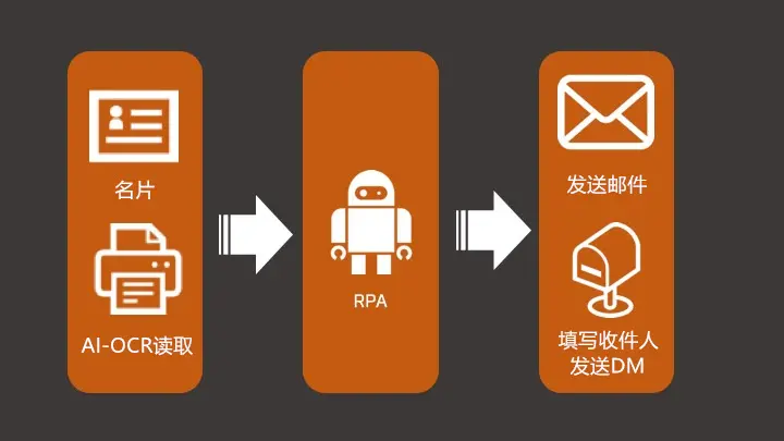 RPA与AI-OCR技术相结合,还可同时实现名片管理和DM传输的自动化。