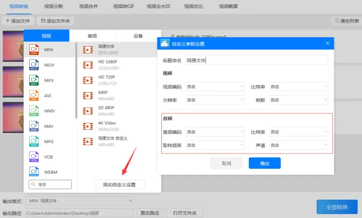 3、如果要自定义输出的视频分辨率可以点击添加自定义设置去设置音频格式的音频编码、比特率、取样频率和声道的各项参数。