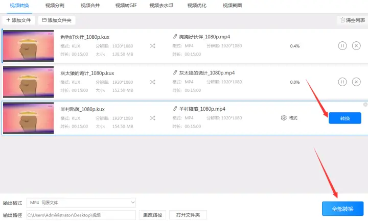 5、最后点击转换或全部转换把kux格式转换成mp4,然后等待转换的进度条到达100%就表示视频已经转换好了。转换好视频后点击覆盖在转换按钮上的打开按钮或者打开之前预设的输出路径就可以找到转换后的视频了。