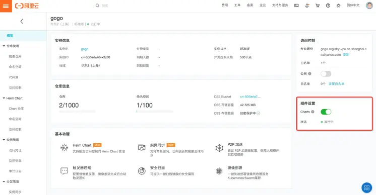 容器镜像服务企业版支持 v2 版本的 Chart 安全托管,在企业版实例概览页开启 Charts 组件,待组件状态变为运行中,即可开始托管 Chart 类型仓库。