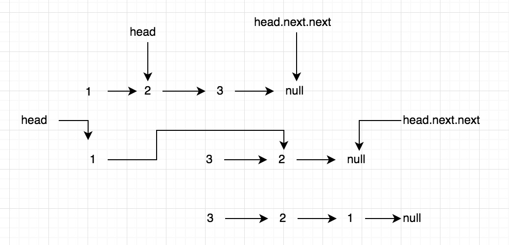 递归理解起来比较绕。假设有 1->2->3->null 这样一个链表,当执行到3时开始反转,此时 list 为 3->null,head 为 2,此时2的状态为 2->3->null,要变为 3->2->null 则需要让 head.next.next = head,并且