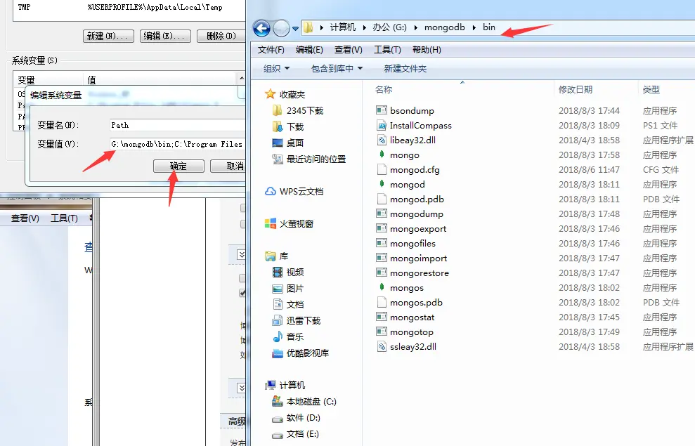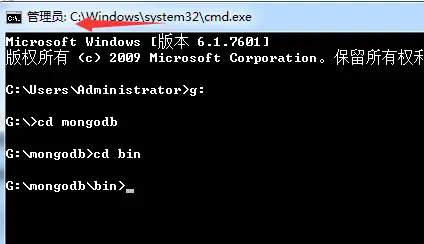 2.进入G盘,也就是你安装的目录,g:\mongodb\bin;(一定要先进入G盘,让cd到你的目录 cd mongodb, 然后在cd bin这个目录下)