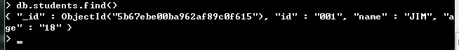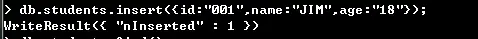 db.students.insert({id:"001",name:"JIM",age:"18"});这个就是我们插入的数据