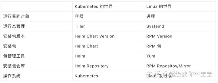 人们擅长于用已知来理解未知,我们就用下表来简单地介绍 Kubernetes 的世界中 Helm 的角色。