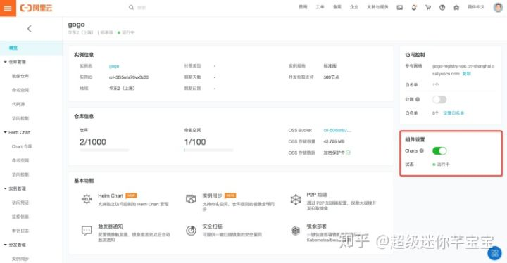 容器镜像服务企业版支持 v2 版本的 Chart 安全托管,在企业版实例概览页开启 Charts 组件,待组件状态变为运行中,即可开始托管 Chart 类型仓库。
