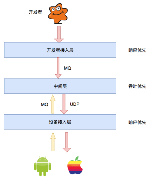 设备接入层不仅要接收设备的登录、下线等状态命令,还要把开发者的消息推送给设备。这个时候设备接入层就需要维护设备的状态信息(当然可以专门拆一个状态服务去维护这些信息,要求这部分必须少有代码更新,具体原因自己去想哦=_=)。这个时候设备接入层的每台server都保留一批设备的状态信息cache,设备应该连接哪台server去获取数据,同时中间层的消息又该发往哪个server去推送呢?这就用到了一致性hash算法。