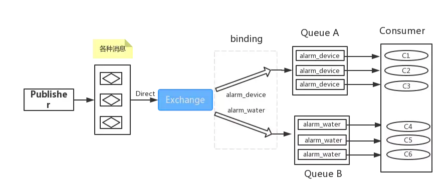 direct类型的Exchange路由规则也很简单,它会把消息路由到那些binding key与routing key完全匹配的Queue中。