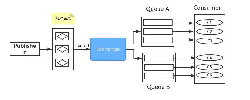 这种类型的Exchange,就是群发,此exchange的路由规则很简单直接将消息路由到所有绑定的队列中,无须对消息的routingkey进行匹配操作。