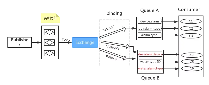 binding key 并不是在所有情况下都生效,它依赖于Exchange Type,比如fanout类型的Exchange就会无视binding key,而是将消息路由到所有绑定到该Exchange的Queue。