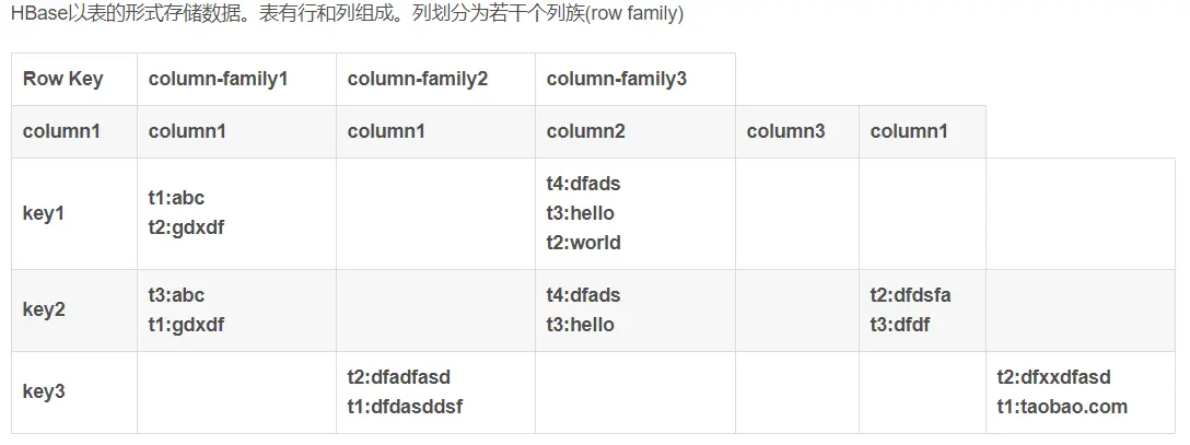 Rowkey:行键,和mysql的主键一样,不允许重复,按照字典顺序排列