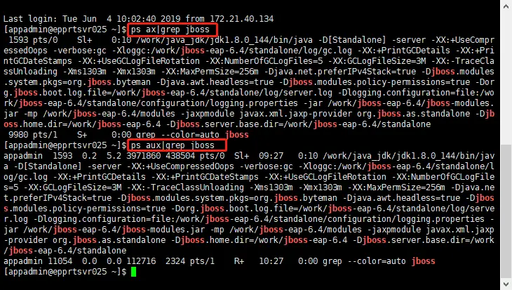 2.查看jboss指令:简单方法 ps ax|grep jboss,复杂指令 ps aux|grep jboss