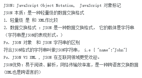 - json对象就是存在到javascript当中,json就是传输数据的一种格式,中间数据类型,json字符串就是json格式的字符串。