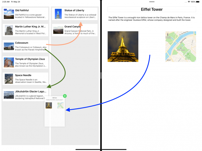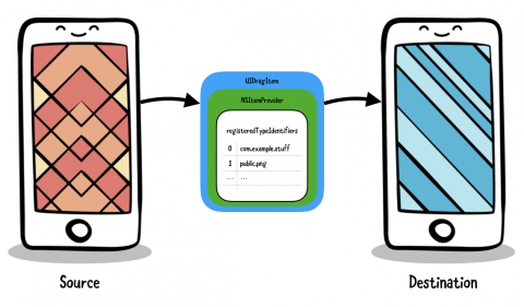 从源应用程序拖动项目时,拖动活动(drag activity)将开始,系统将创建拖动会话(drag session)。 源应用程序(source app)设置拖动项(drag item)以在拖动活动开始时表示基础数据。 在目标应用(destination app)中放置该项结束拖动活动。