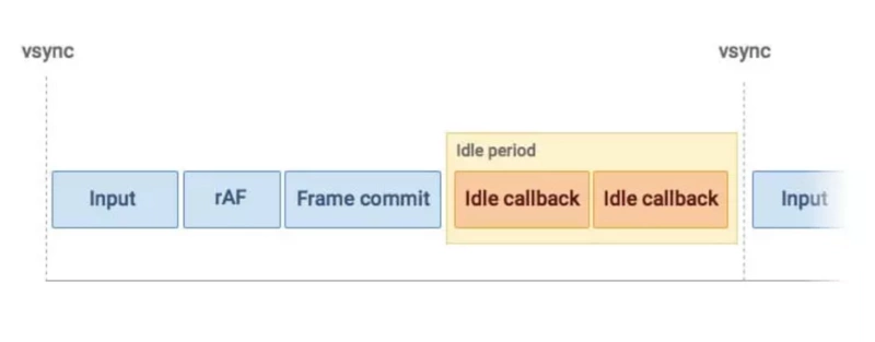 假如某一帧里面要执行的任务不多,在不到16ms(1000/60)的时间内就完成了上述任务的话,那么这一帧就会有一定的空闲时间,这段时间就恰好可以用来执行requestIdleCallback的回调,如下图所示: