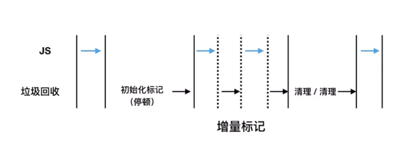 为了降低全部老生代全堆垃圾回收带来的停顿时间,V8将标记过程分为一个个的子标记过程,同时让垃圾回收标记和JS应用逻辑交替进行,直到标记阶段完成。