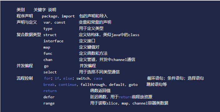 - Go关键字(25个),如上图。