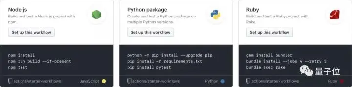于是,一旦你给项目启用了Actions,GitHub就会根据你的项目,匹配一些合适的工作流推荐出来。