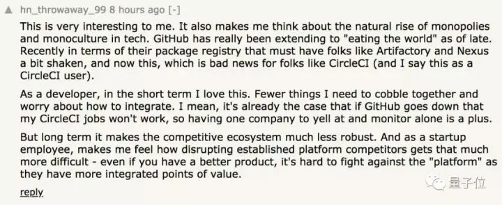对我来说这很有趣,让我想到垄断的自然崛起和技术中的多元文化。GitHub最近仿佛要“吃掉整个世界”,比如之前的软件包管理,给了Artifactory也Nexus不小的撼动。现在搞这个,可能对CircleCI是个坏消息(我是CircleCI的用户)。
