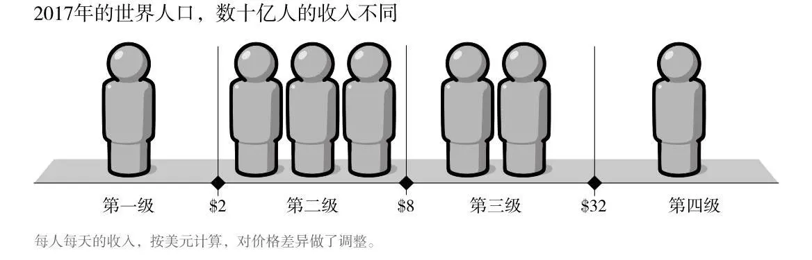 每一个小人代表10亿人口,收入水平是用人均每日的收入来代表的。你可以看到,绝大多数人生活在中间的两个级别。