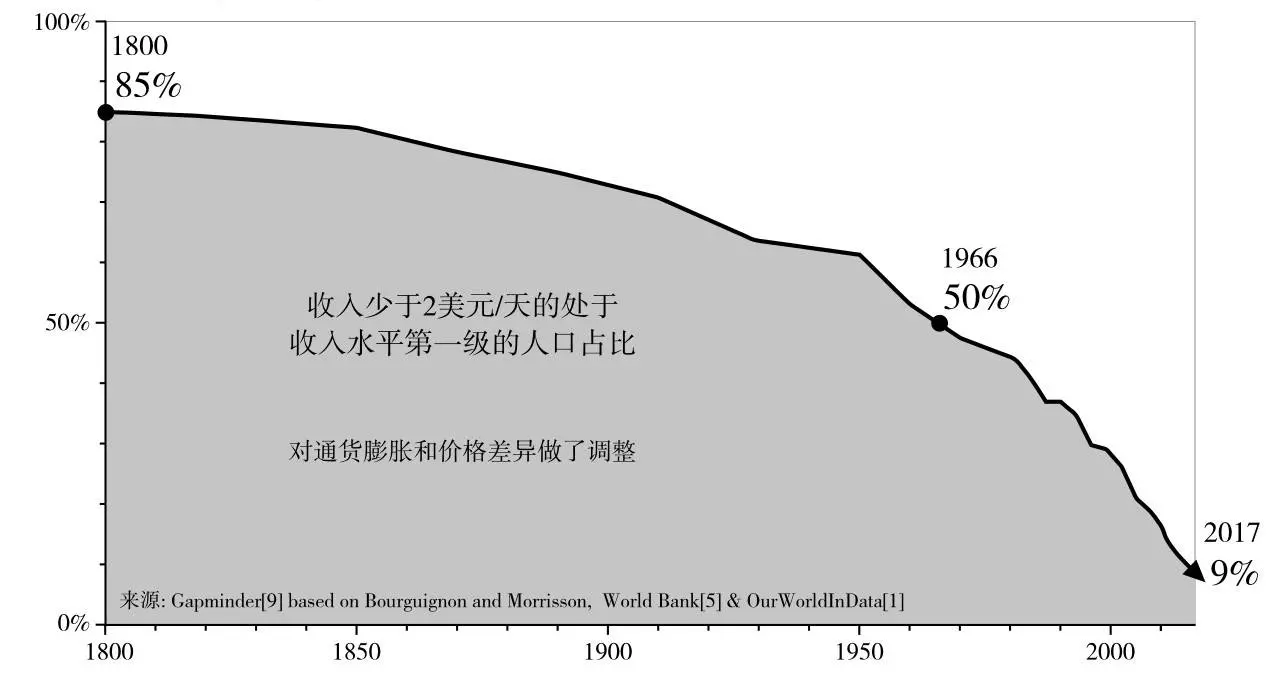 世界上的极度贫困人口比例,自1800年开始,一直是在下降的。而在最近的20年间,极度贫困人口的比例下降的速度比历史上以往任何时候都快。