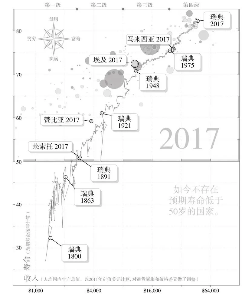 一系列气泡移动的轨迹显示了瑞典这个国家的健康和财富状况自从1800年以来的进步。
