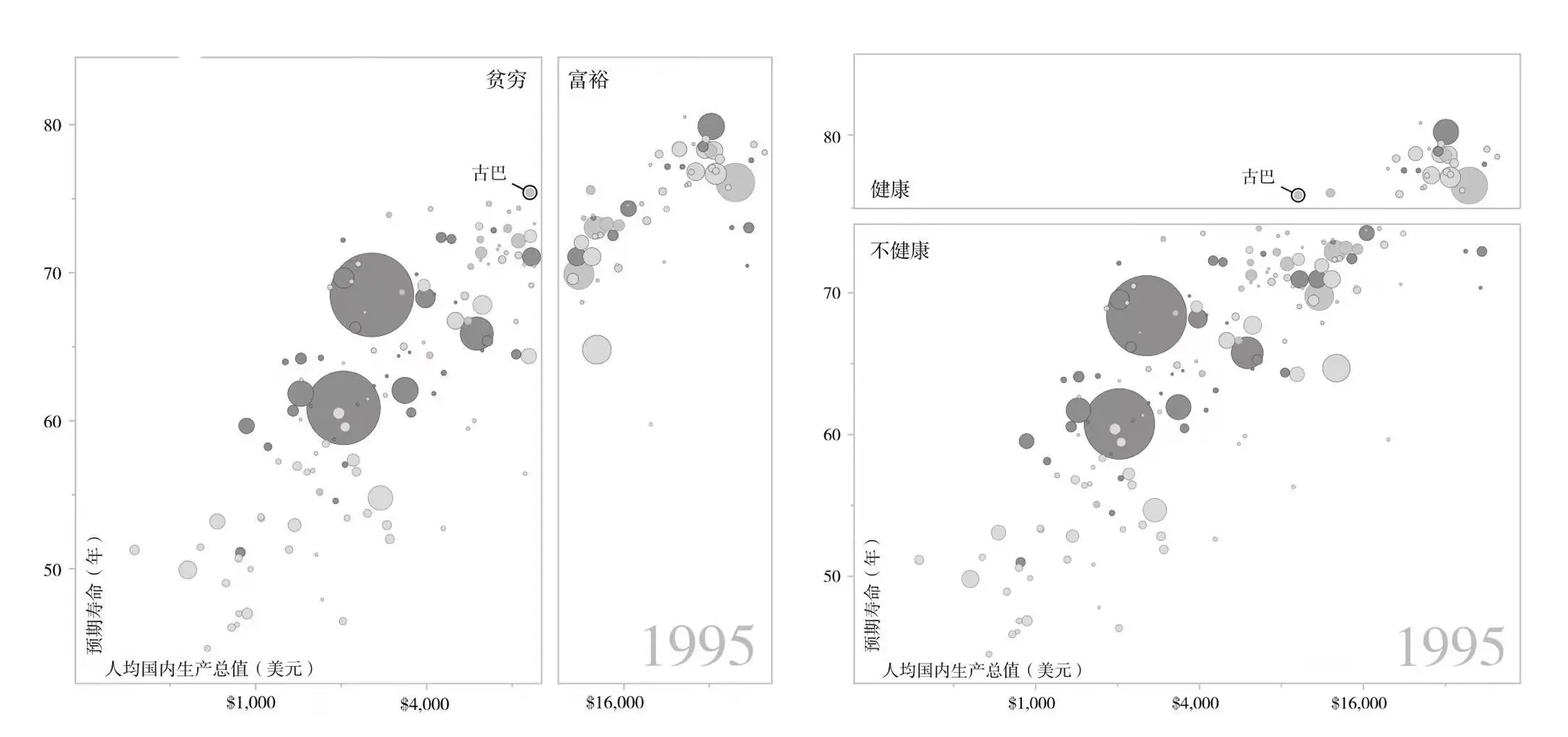 如下图所示,从不同角度来看一个数据,古巴是贫穷国家中健康水平最高的,同时也是同等健康水平的国家中最穷的。