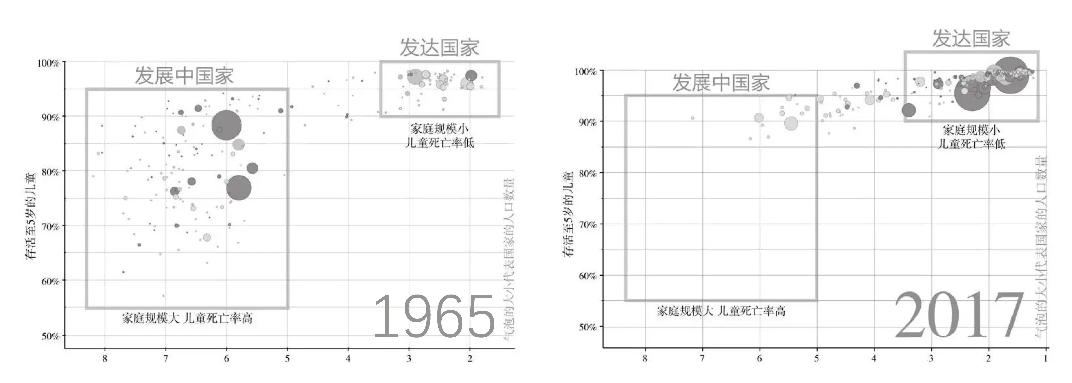 1965年的世界,按照家庭生育小孩数量和存活比率,当时世界发达国家和发展中国家是有个非常明显的分割线的,世界是一分为二的。