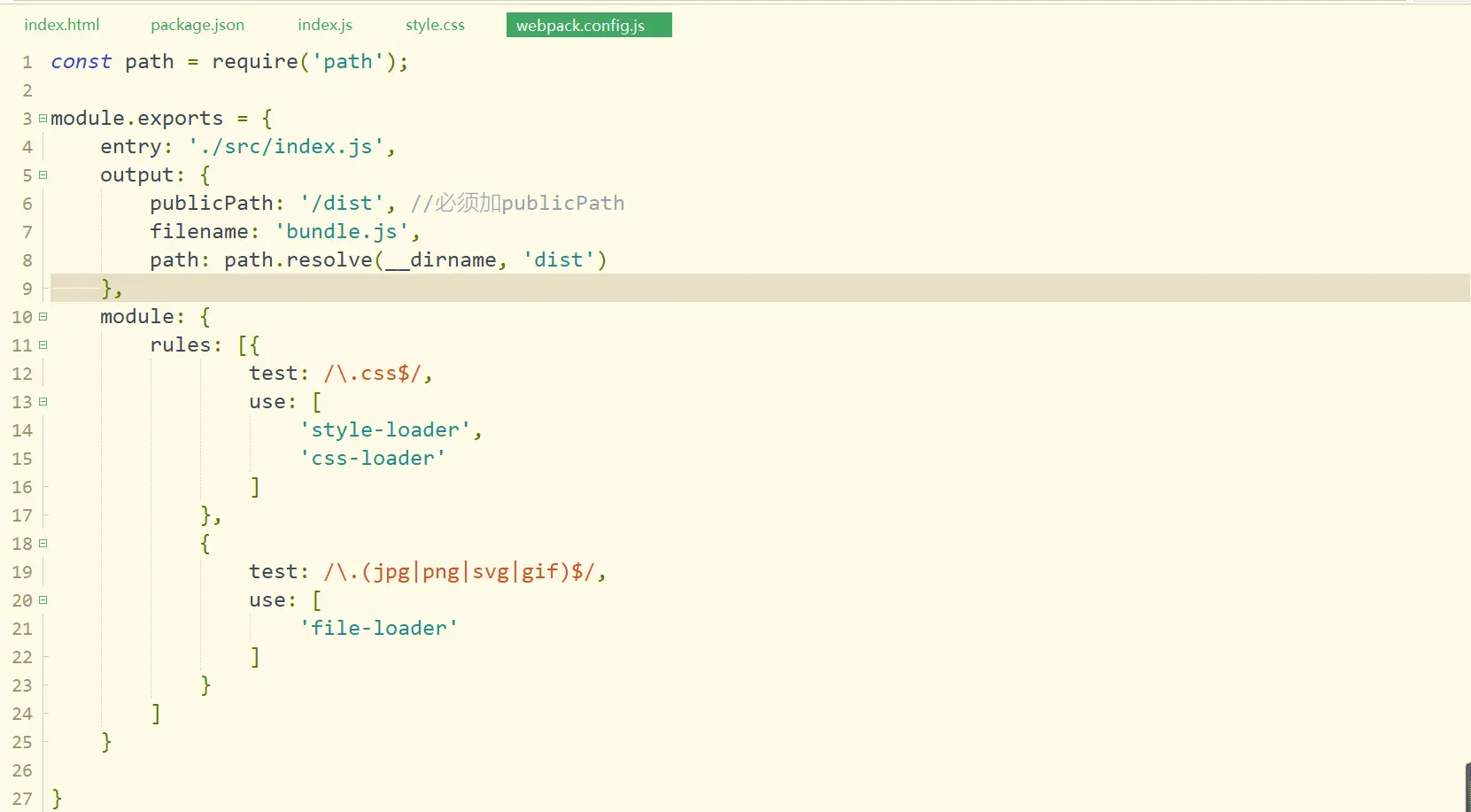 webpack 根据正则表达式,来确定应该查找哪些文件,并将其提供给指定的 loader。在这种情况下,以 .css 结尾的全部文件,都将被提供给style-loader和css-loader。 这使你可以在依赖于此样式的文件中 import 'style.css'。