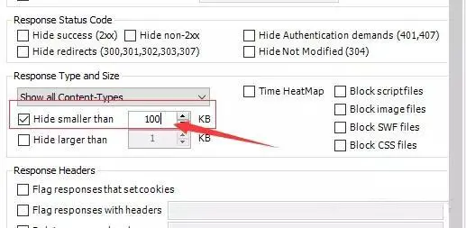 2.我们只需要过滤出大于100k的请求(也可以设置大于50k,看自己的需求) 3.勾选Hide smaller than 100KB(隐藏小于100k的请求)