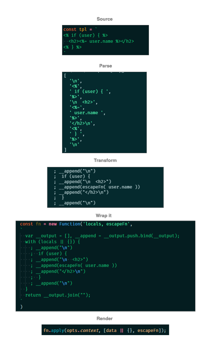 上面一张图,已经大概把一个简单模板引擎(这里以EJS为例)的原理解释得七七八八了。本文将描述一个简单的模板引擎是怎么运作的?包含实现的关键步骤、以及其背后的思想。