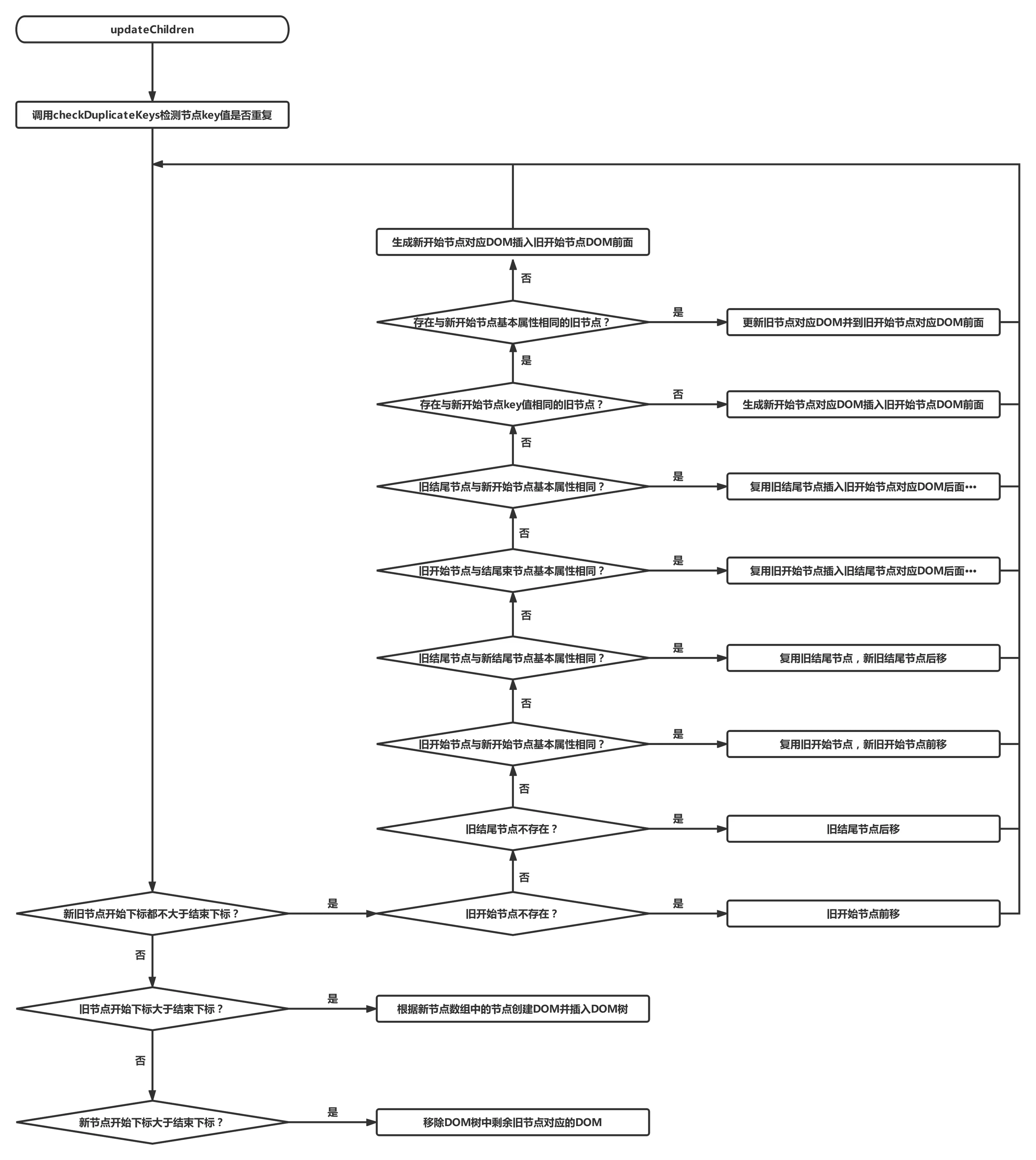 如果标签节点基本属性一样,可以被复用,则通常只需更新真实DOM的属性和子节点即可。子节点的更新由 updateChildren 函数完成。在 updateChildren 中主要采用双端比较算法来进行新旧子节点对比。