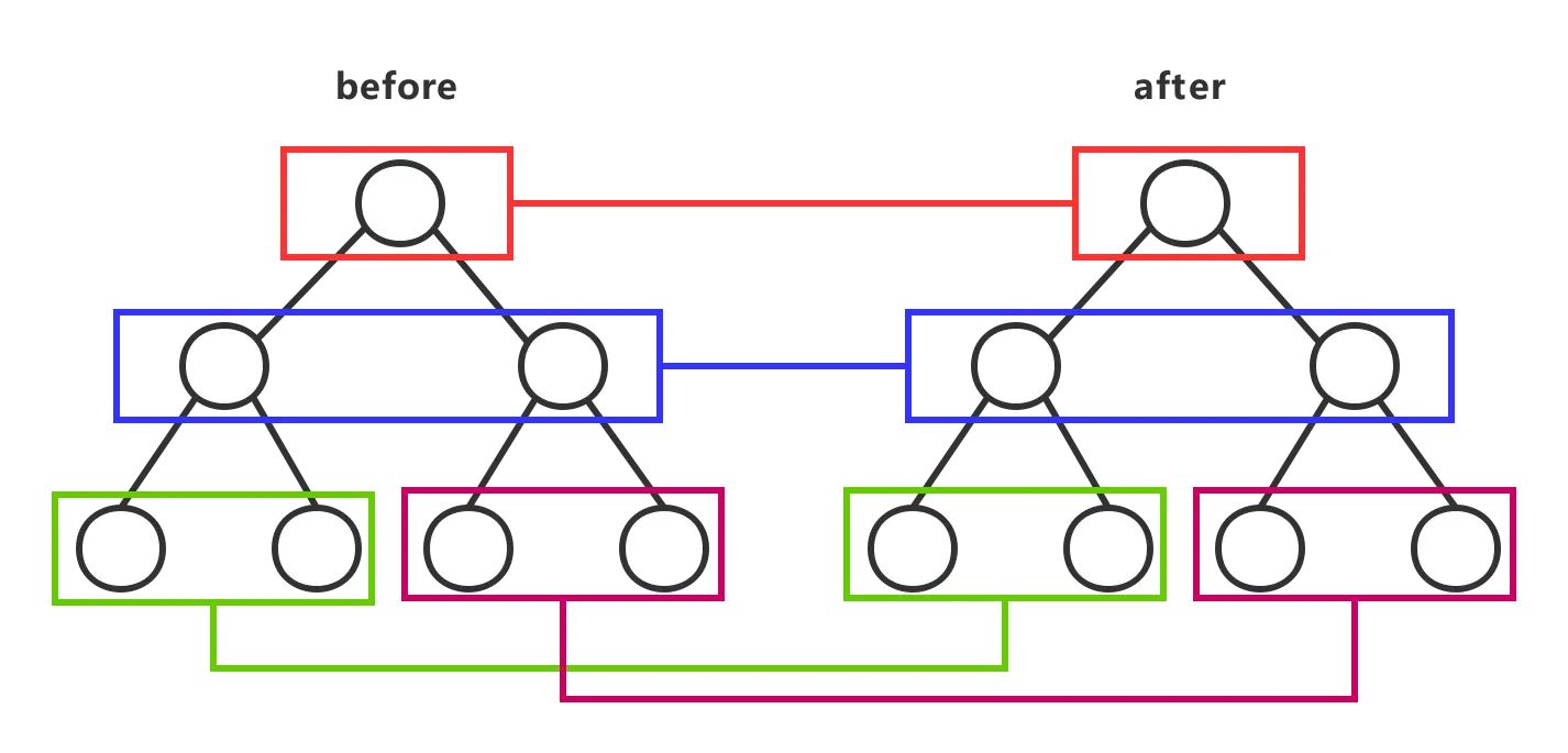 首先要说明Vue的 diff 算法在比较节点时,只会进行同级比较,不会跨层比较。如下图所示: