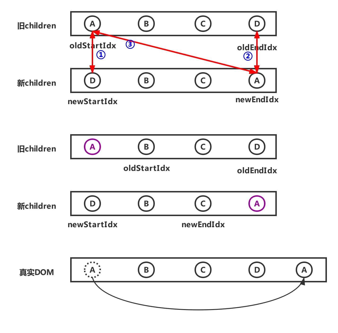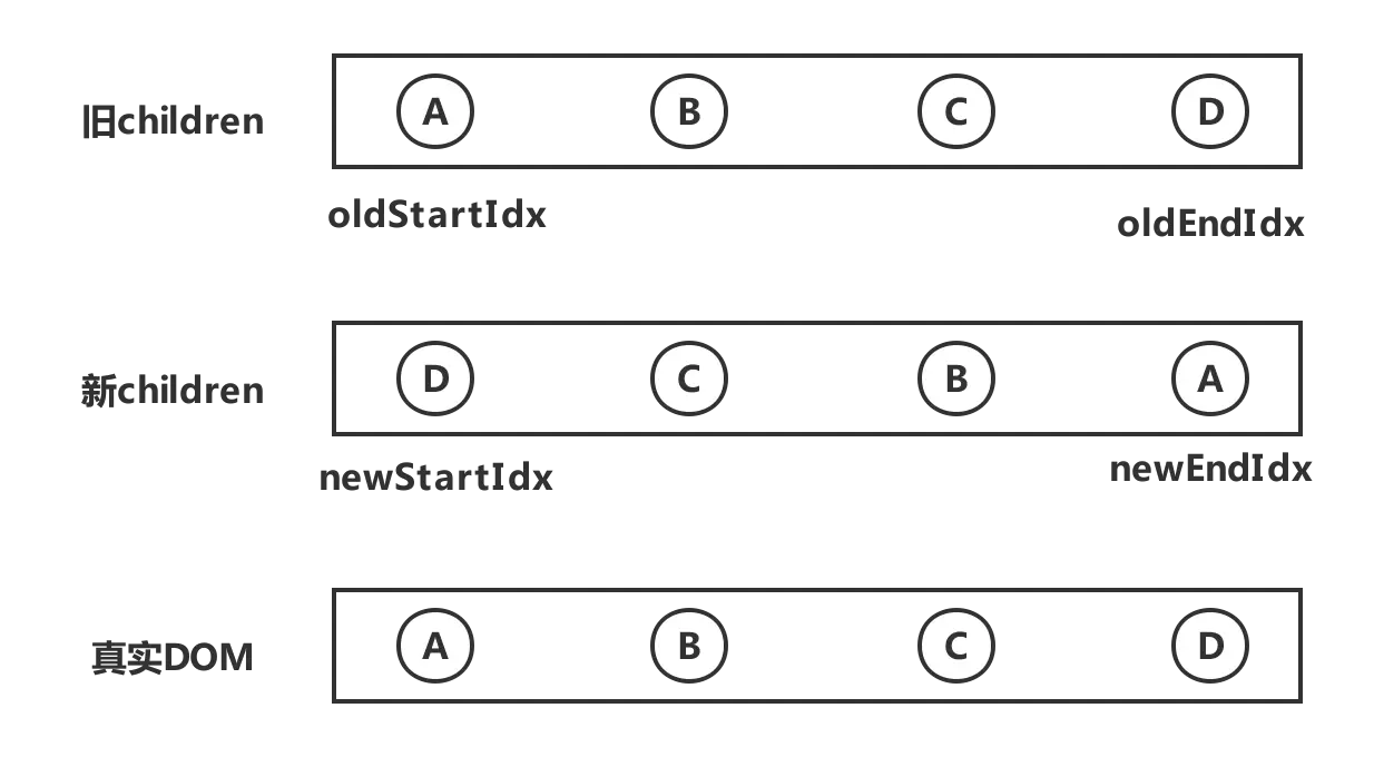 Vue 采用双端比较算法来进行节点复用,会定义四个数组下标变量:旧开始节点下标oldStartIdx、旧结尾节点下标oldEndIdx、新开始节点下标newStartIdx、新结尾节点下标newEndIdx。同时定义四个指向新旧首尾节点的变量:旧开始节点oldStartVnode、旧结尾节点oldEndVnode、新开始节点newStartVnode、新结尾节点newEndVnode。