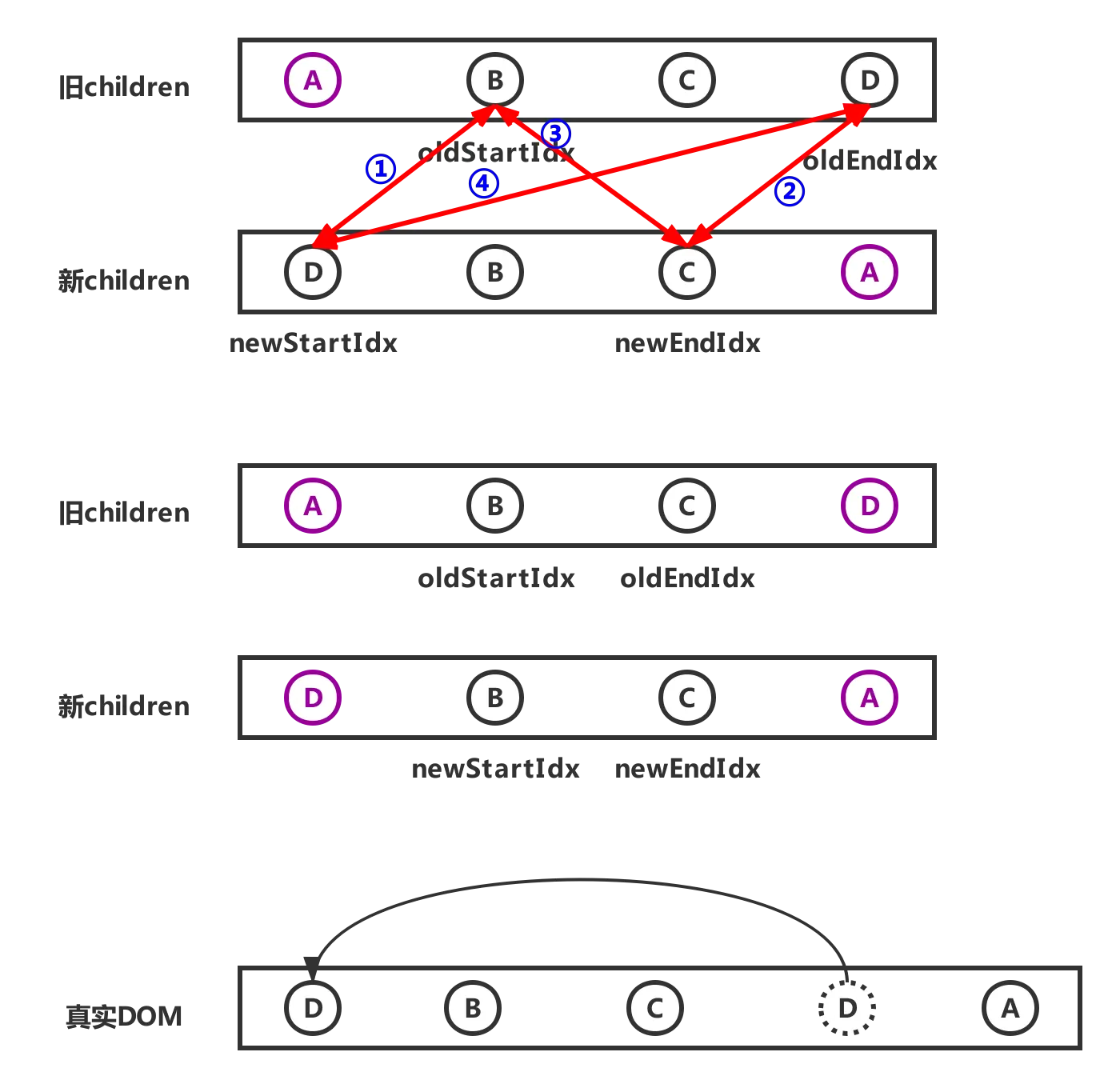 双端比较算法会逐步比较这四个节点,旧节点数组中有可复用节点则依照如下规则处理: