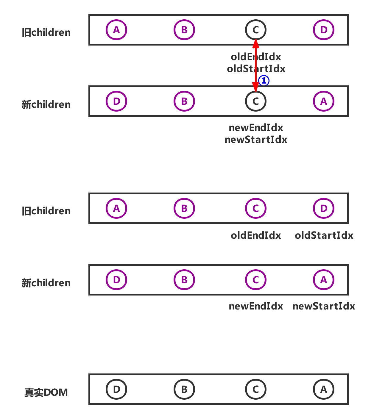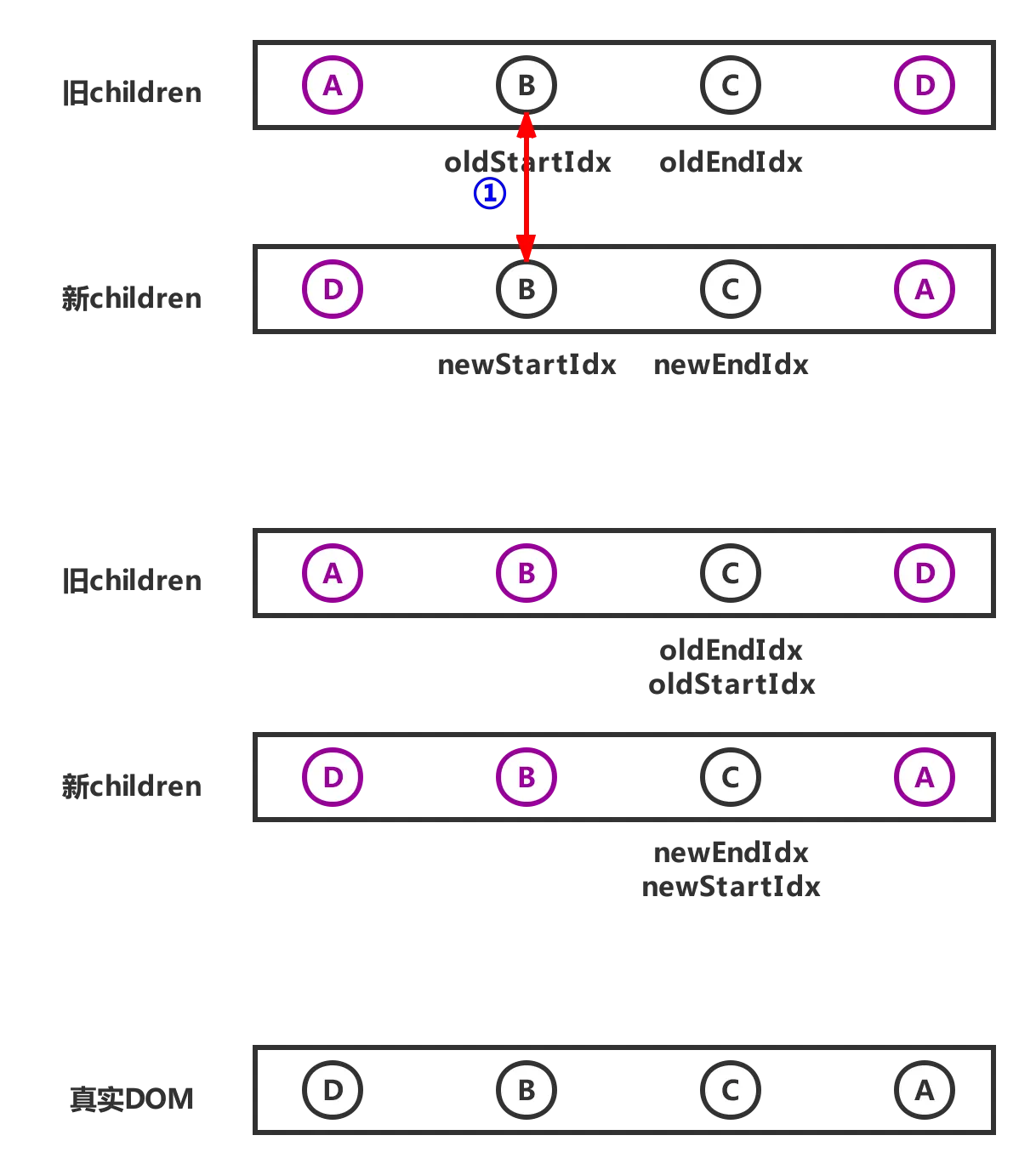 举个节点全部都可以复用的例子,这是双端比较算法最理想的情况: