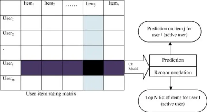 由CF生成的结果可能是预测,也可能是推荐。预测表示用户i的项目j的预测得分的数值Rij,而推荐是用户最喜欢的前N个项目的列表,如图下所示。