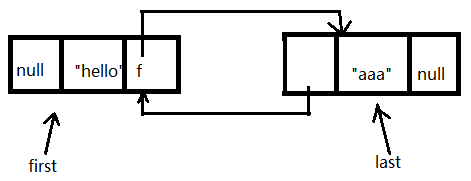 先是将transient Node<E> first;赋值给f,因为前面添加了元素aaa,所以f会指向aaa节点。再将前驱为null元素值为e后继为f的节点Node赋值给newNode,再将newNode赋值给first,此时first和last已经不指向相同的元素了,再将f的前驱指向newNode,随着方法的结束f和newNode也会随之失效,最终的效果会是这样。