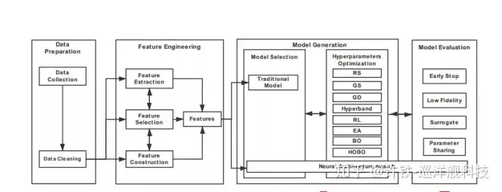 从流程先后顺序来分,最初是数据准备,包括数据收集和清洗,之后是特征工程,其中包括特征选择(决定哪些特征需要保留),特征提取(对特征进行降维,常用的方法例如PCA),特征组合(将多个特征合并/构建为一个新的特征);在之后的模型构建中,最关键的是模型选择,之后超参数优化,可以采取很多方式,最简单的做法是网格搜索,常用的方法包括用强化学习,进化算法,贝叶斯优化,以及梯度下降,来缩小搜索空间;最后,AutoML通过引入提前停止,降低模型的精度,参数共享来自动化模型评价的过程。
