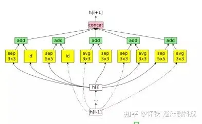 为了找到合适的网络架构,除了传统的串行网络,还有基于cell来做层级化网络架构搜索的。下图展示的是先从几个最基本的操作,搜索得出一个一级的网络组件,之后在自动化的搜索如何用一级组件搭建网络。