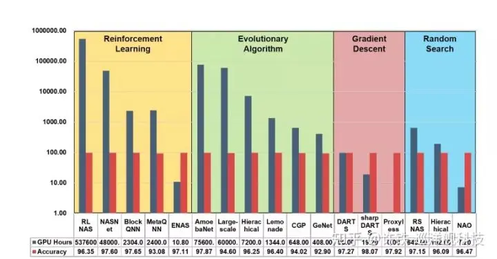NAS算法作为当前AutoML最热的研究领域,有很多变种,下图展示了在CIFAR1000上,不同NAS方法的效果及训练用时。相比于强化学习和进化算法,传统方法的用时更少。