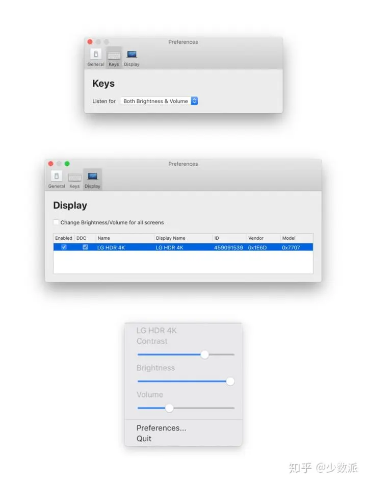如果结合 Keyboard Maestro 或者 Karabiner 这类键盘映射工具,还可以方便地实现用外接键盘调节外接屏幕的音量和亮度,做到几乎和 LG UltraFine 一致的体验。
